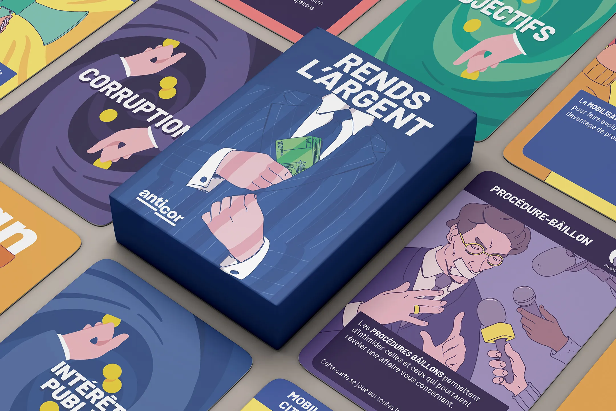 Collaboration à la conception d'un jeu de cartes éducatif pour Anticor, association de référence dans la lutte contre la corruption institutionnelle en France. Chaque carte illustre un type d'infraction que l'association combat : corruption, trafic d'influence, prise illégale d'intérêts, favoritisme etc. Mission : développer l'identité visuelle du jeu et créer les illustrations de chacune des cartes, en trouvant un langage graphique capable de rendre accessible et engageant un sujet aussi sérieux que la délinquance financière et politique.