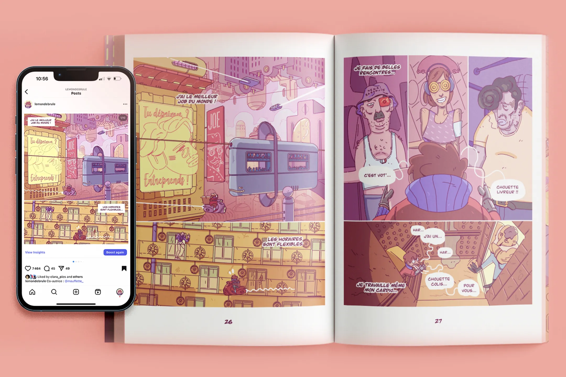 Jean Smart est une bande dessinée écrite, dessinée et publiée aux éditions Le Monde Brûle, dont je suis le fondateur. L'album raconte l'histoire d'un jeune livreur du futur, pris entre son désir de réussite et les contraintes d'un monde urbain entièrement colonisé par les plateformes numériques. Prépublié gratuitement sur Instagram, l'album a été lu par plus de 30 000 personnes avant sa publication papier.