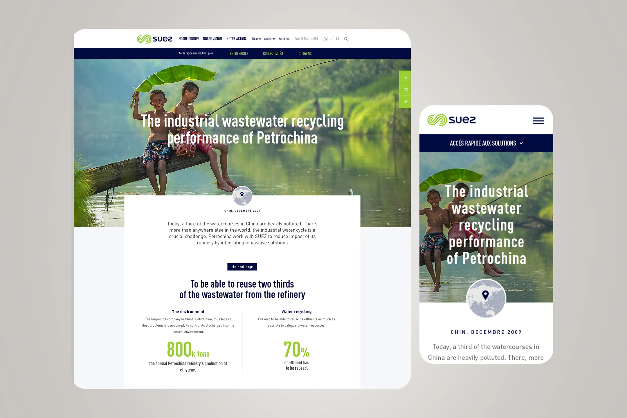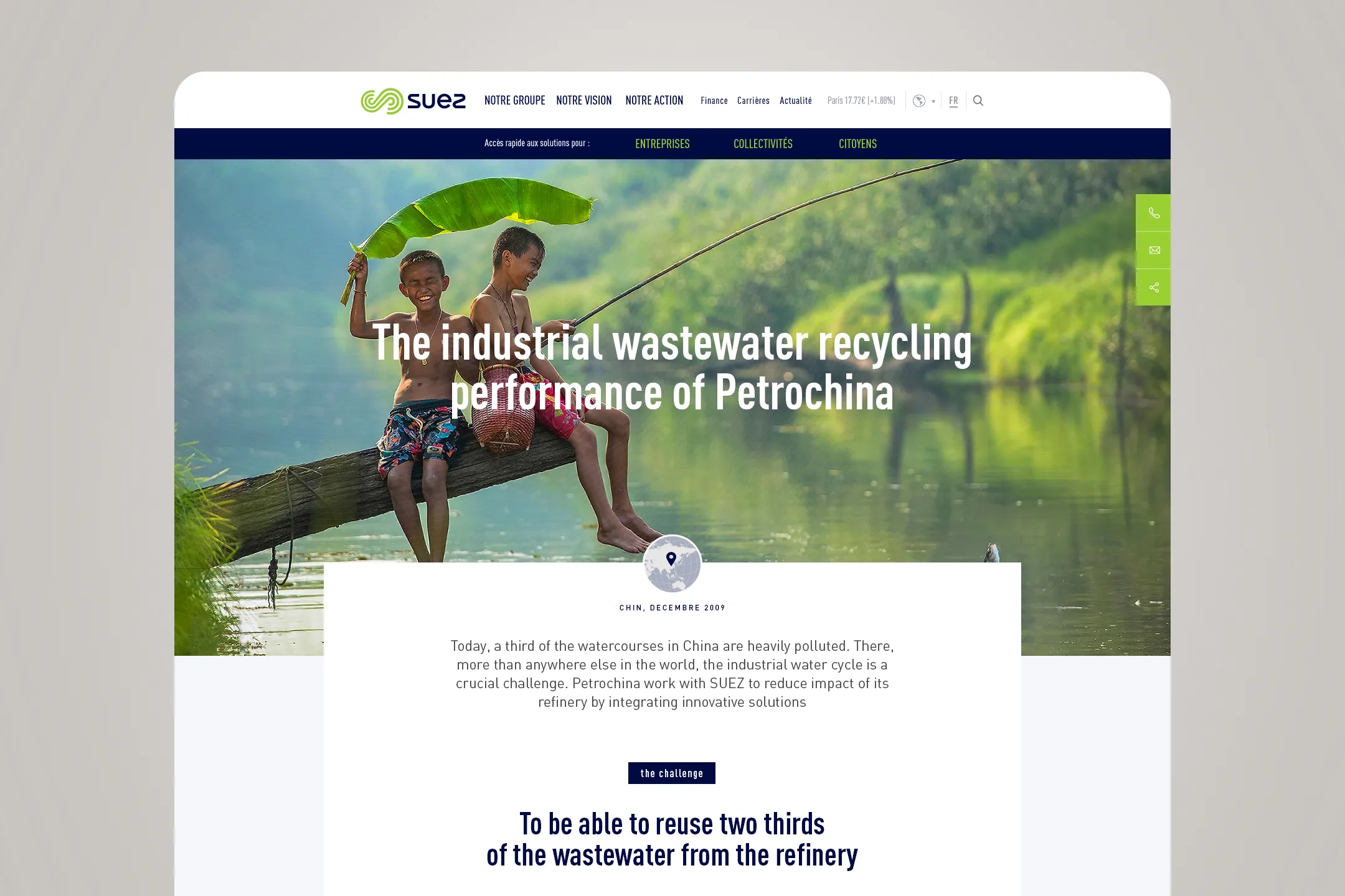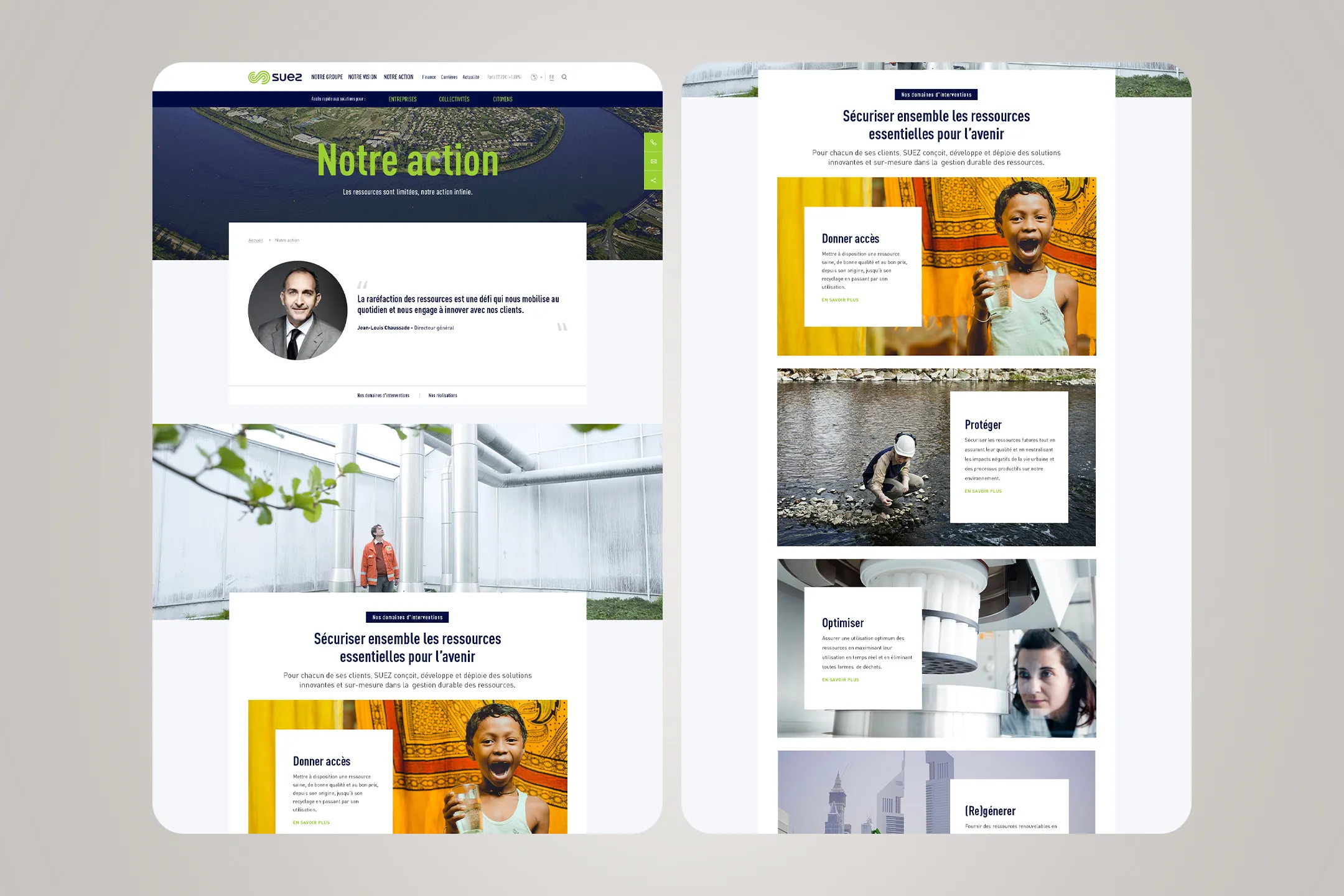 Refonte du site corporate du groupe Suez. Réconcilier l'histoire d'une marque industrielle centenaire, l'excellence de son expertise technique dans la gestion durable des ressources — eau, déchets, traitement, aménagement urbain — et son ancrage dans les grands débats économiques et politiques contemporains au coeur d'une compétition internationale de plus en plus violente. L'enjeu du projet : traduire visuellement ce positionnement : entre l'image de grands paysages industriels, reflets de la puissance de l'entreprise et les hommes au coeur des infrastructures.
