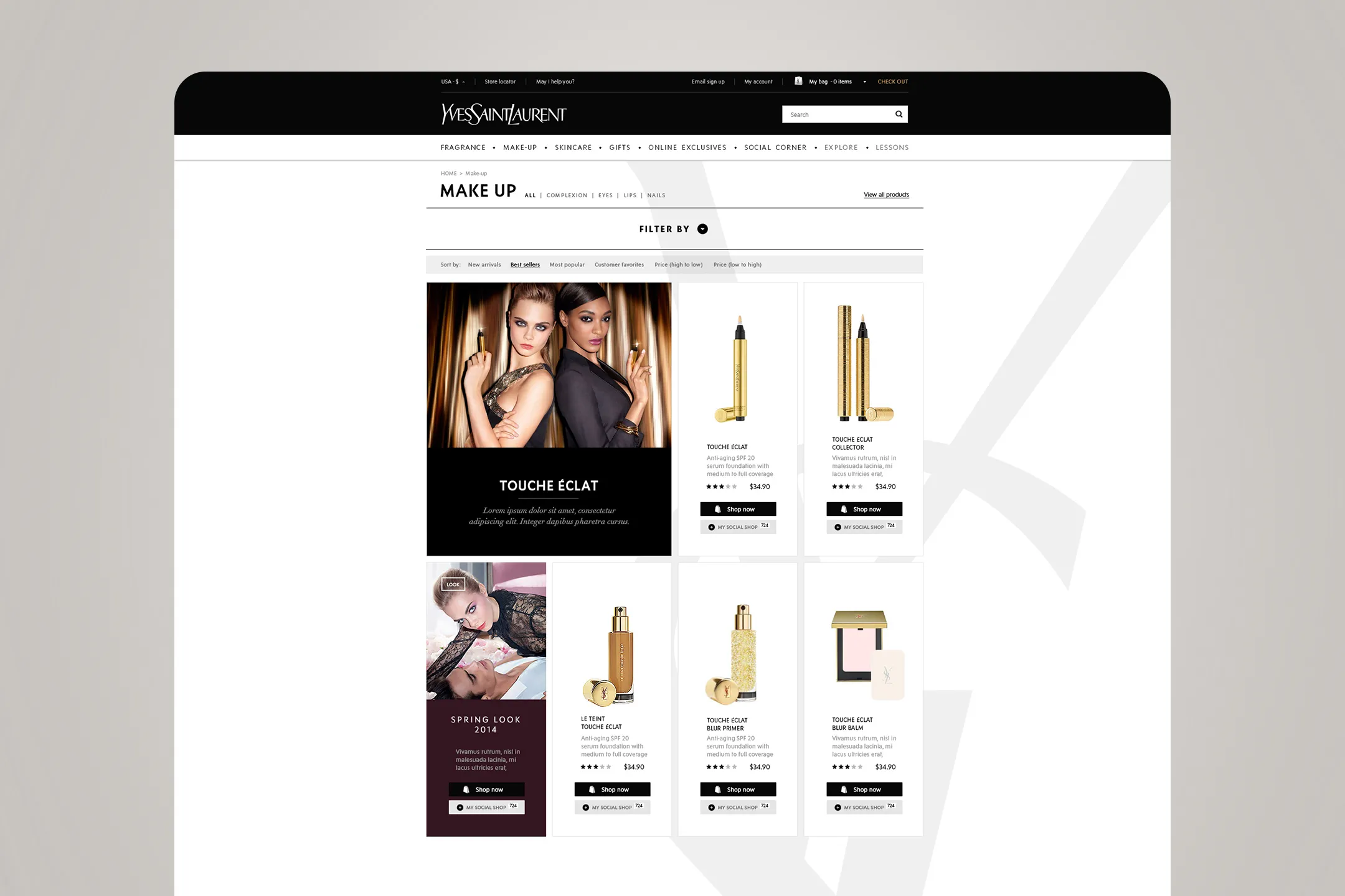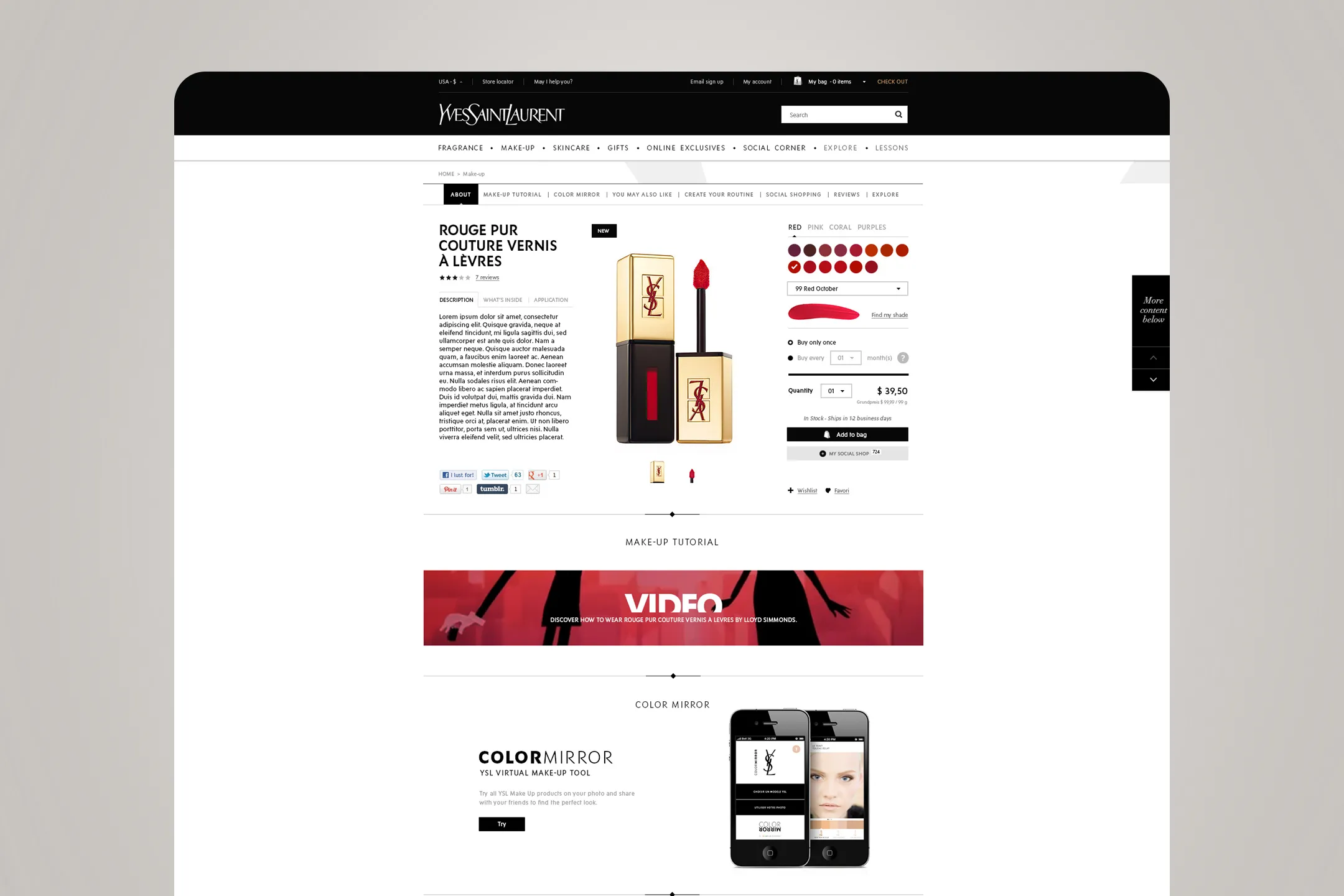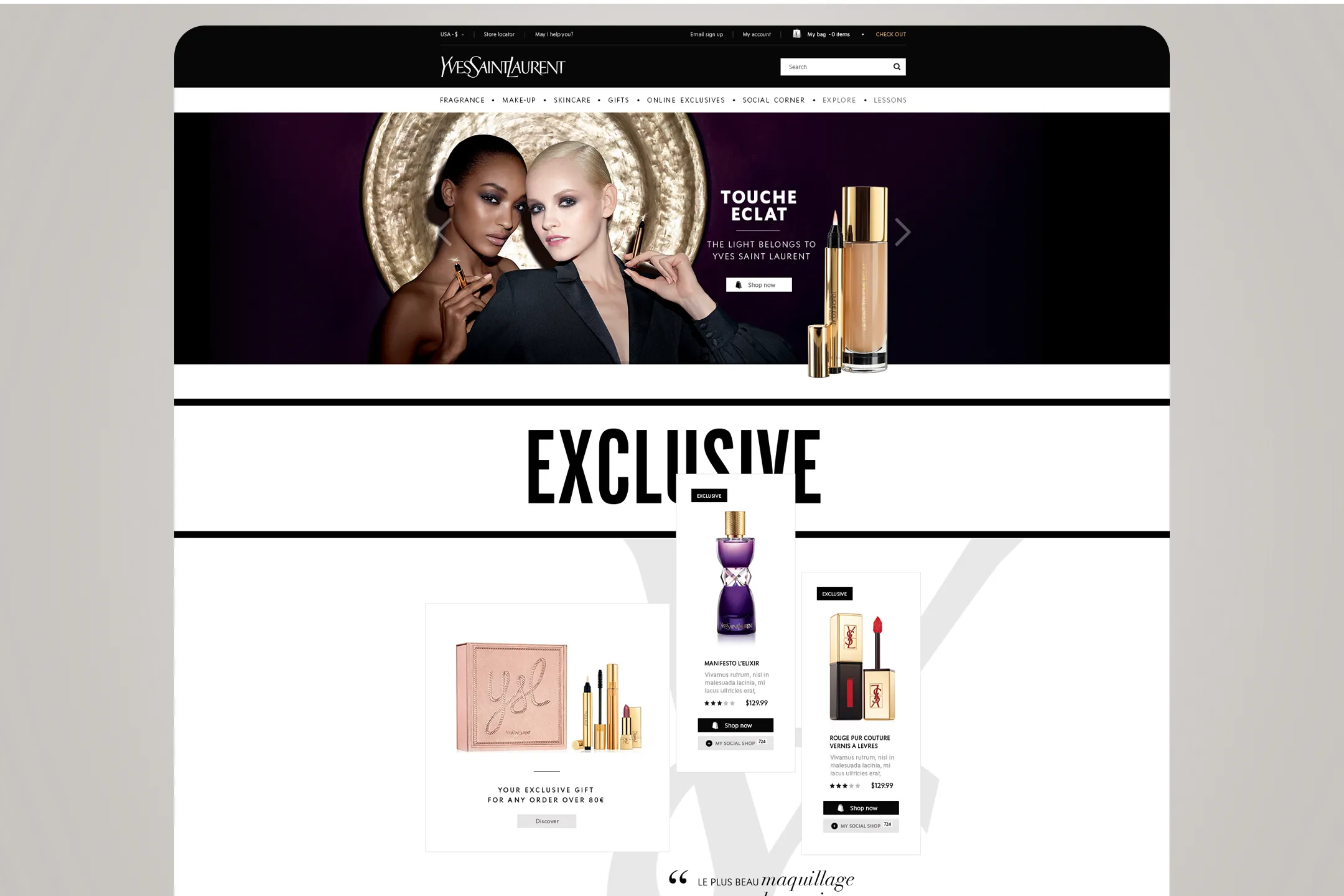 Site e-commerce pour YSL Beauty présentant l'ensemble des produits de la marque. Portée par une élégance parisienne audacieuse, une libération des conventions et une défiance de la norme L'Oréal, YSL Beauty occupe une position singulière dans le luxe : celle d'une maison historique qui se réinvente en pionnière du digital.